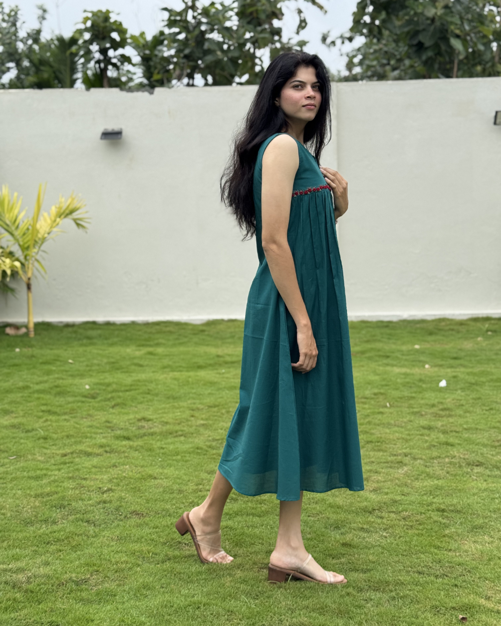 Materials : - Premium Mulmul cotton for a natural, breathable feel - Added lining only in the yoke part of the dress is a best part for extra comfort