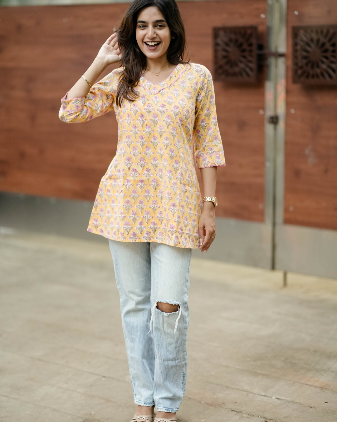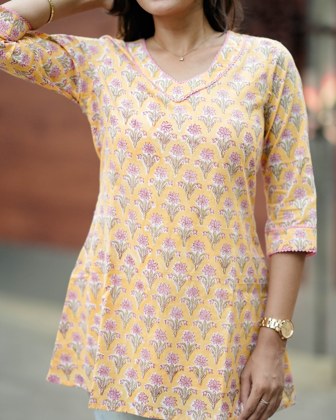 Description: This short top has a leaf “v” neck with contrasting pink lace highlighting the neck and sleeve. This casual tunic top used as a formal as well as a informal top.