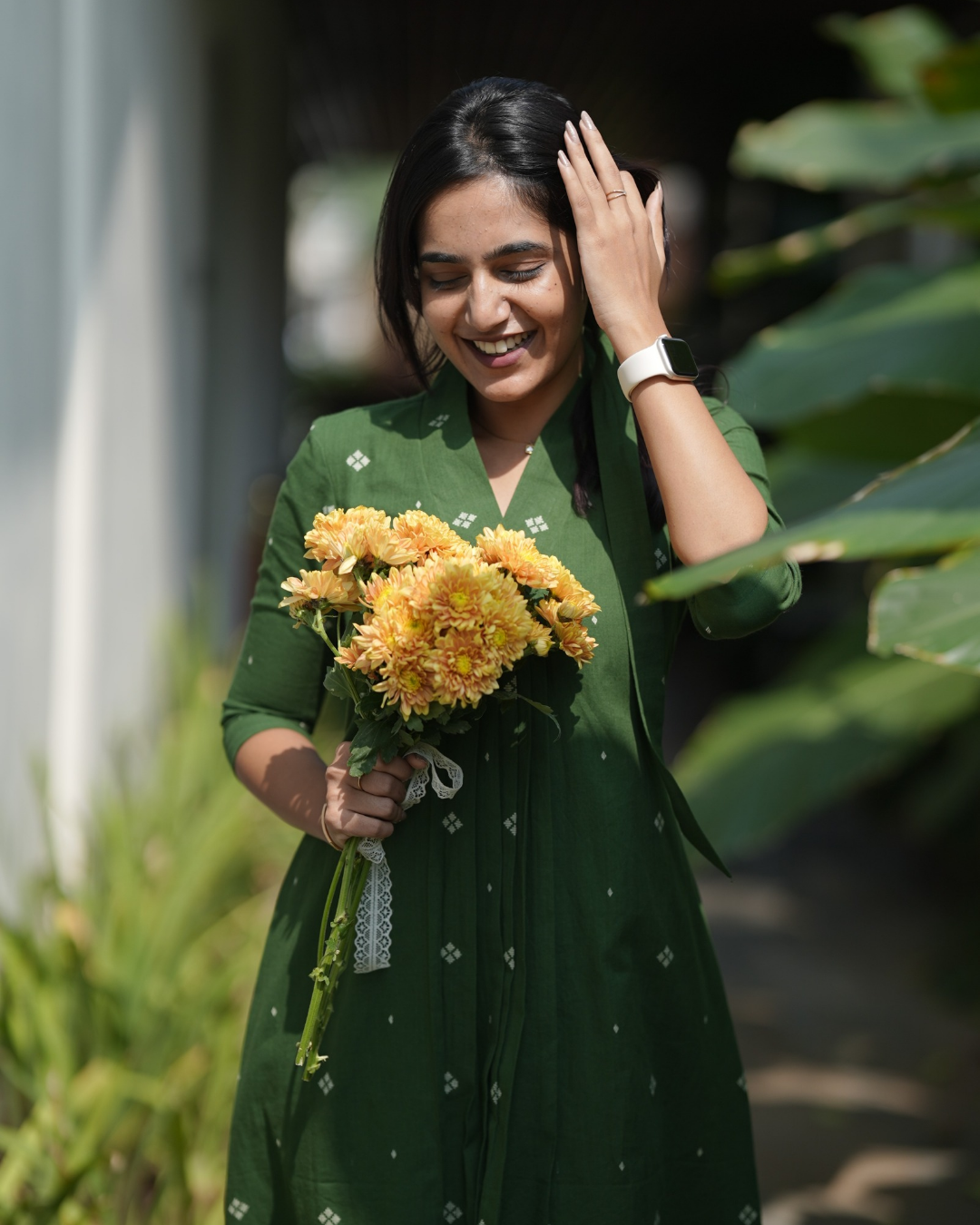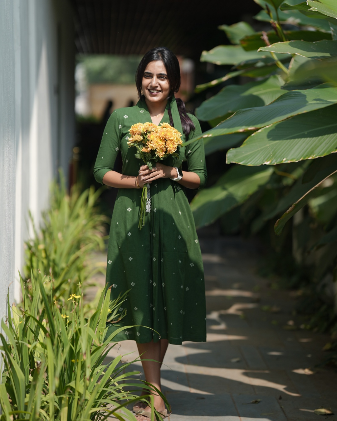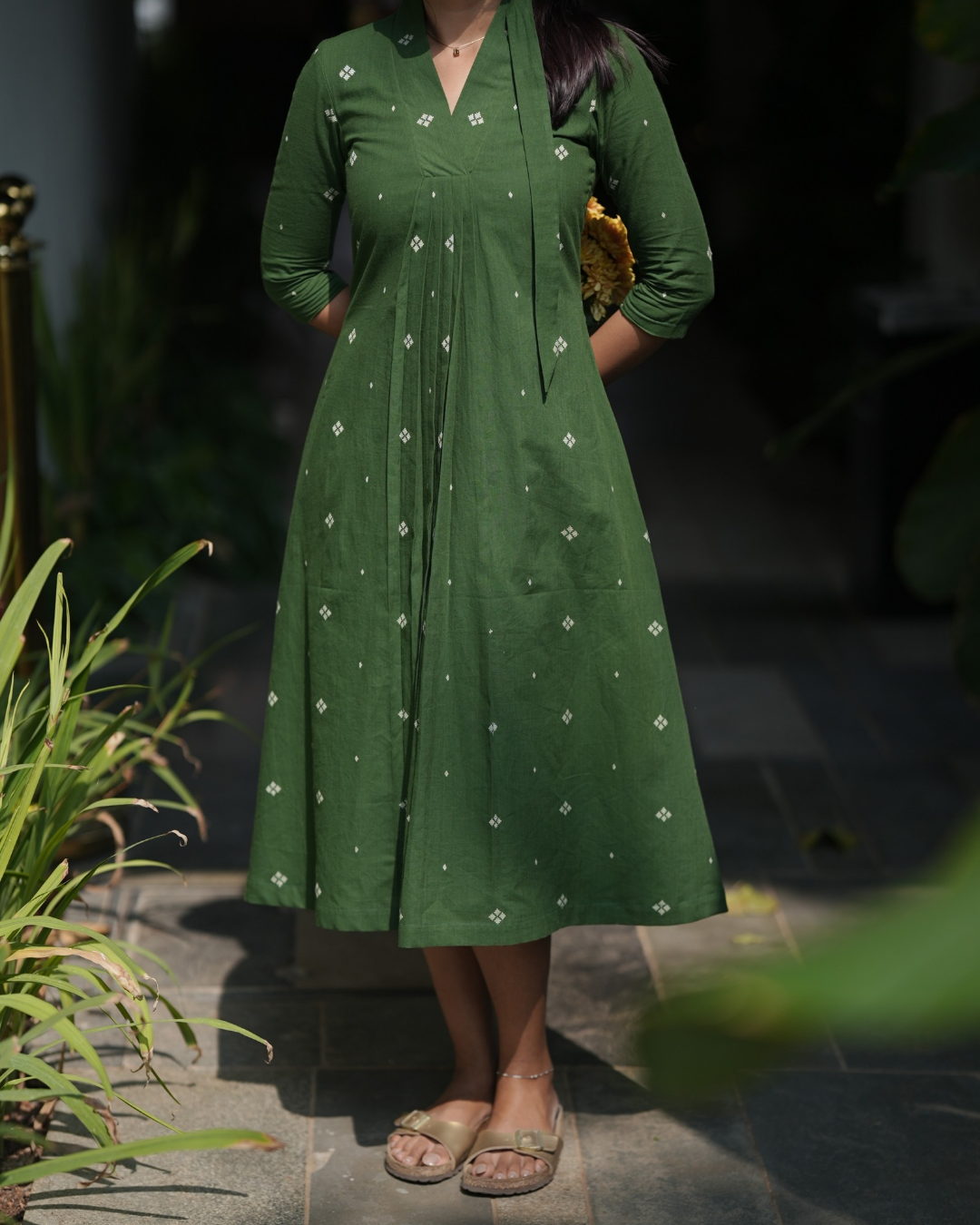 Aline dress comes with high collar overlaped v neck. Designed with small pleats on the yoke