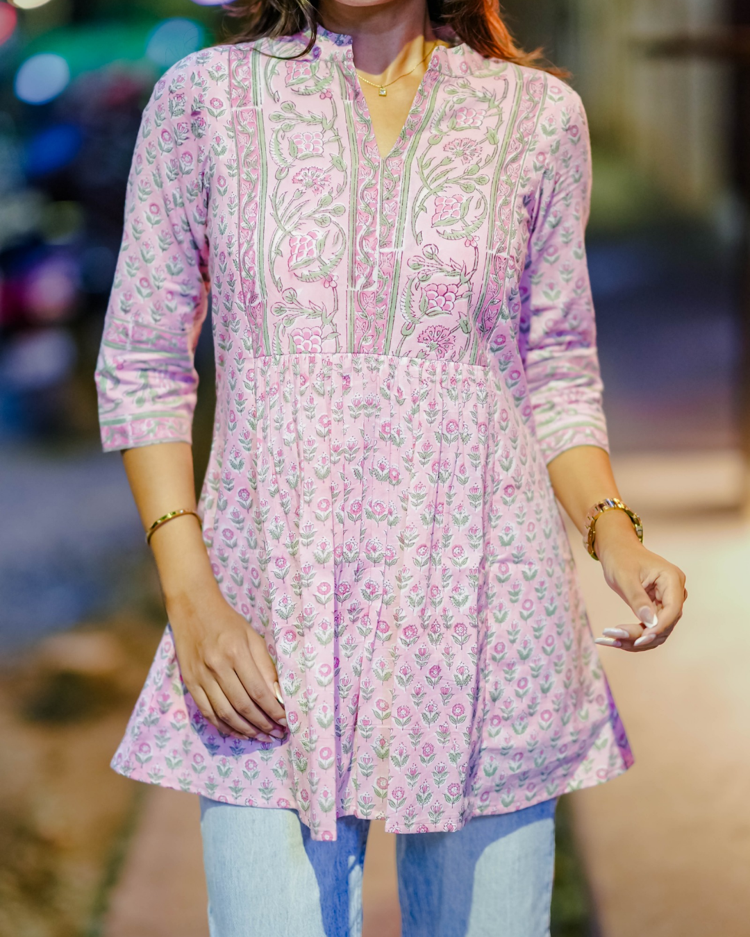 Description: This short top comes with Chinese collar with minimal slit on the neck. Using the border material for yoke and cuff of the sleeve makes it look prettier. It has a slight pleats on the waistline and comes with “ ¾ th” sleeve.